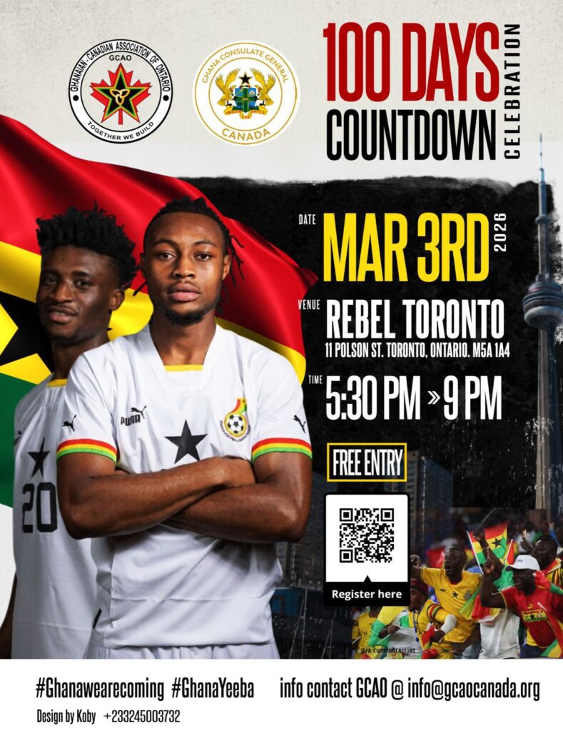 On March 3rd, 2026, the Ghanaian Canadian Association of Ontario (GCAO) and the Ghana Consulate General in Canada will bring our community together at Rebel Toronto, 11 Polson St., Toronto (M5A 1A4) for an unforgettable evening of culture, music, and football spirit. From 5:30 p.m. to 9:00 p.m., fans, families, and friends will gather under one roof to celebrate Ghana, rally behind the Black Stars, and show Canada that #GhanaWeAreComing and #GhanaYeeba in full force.